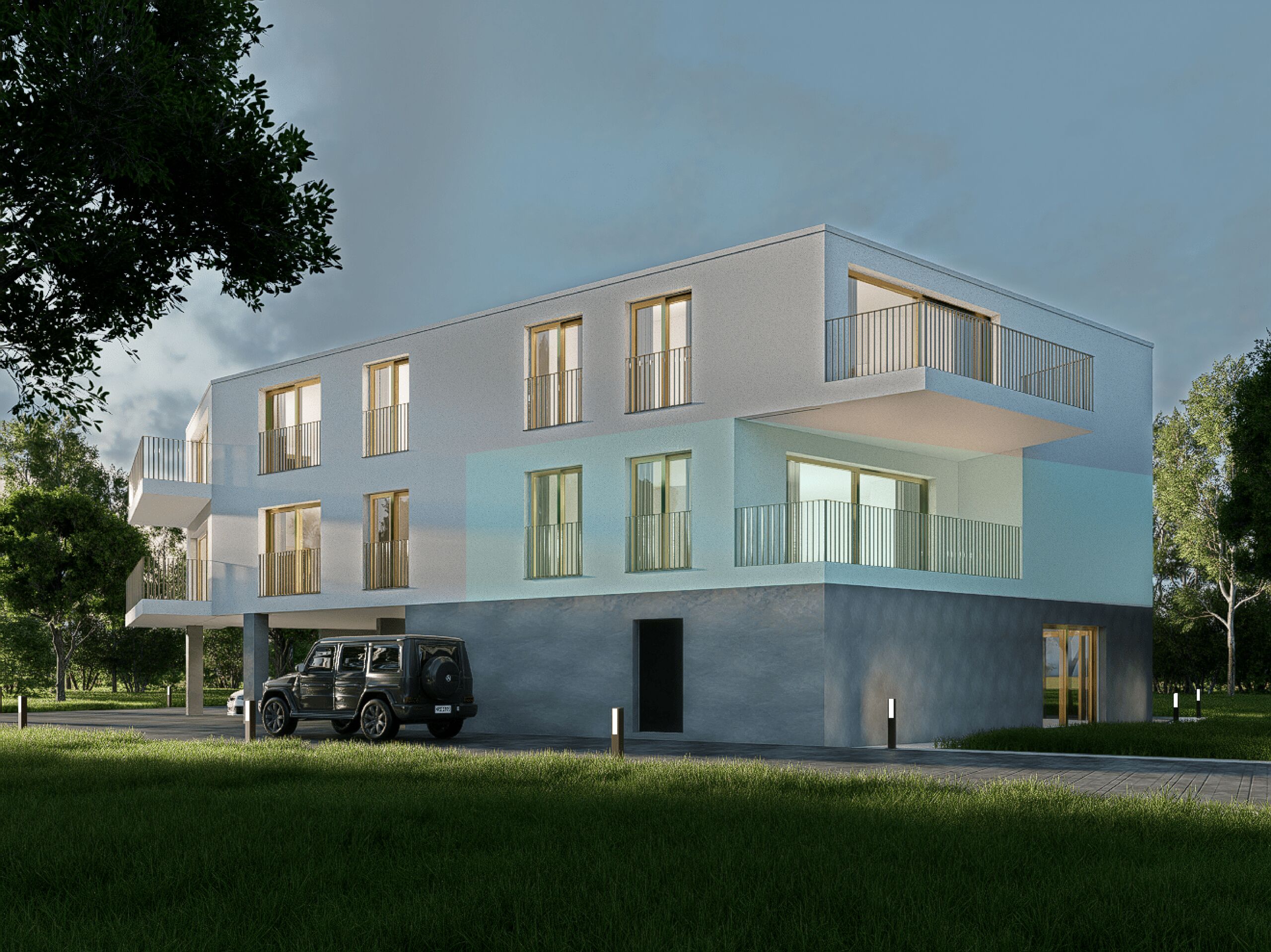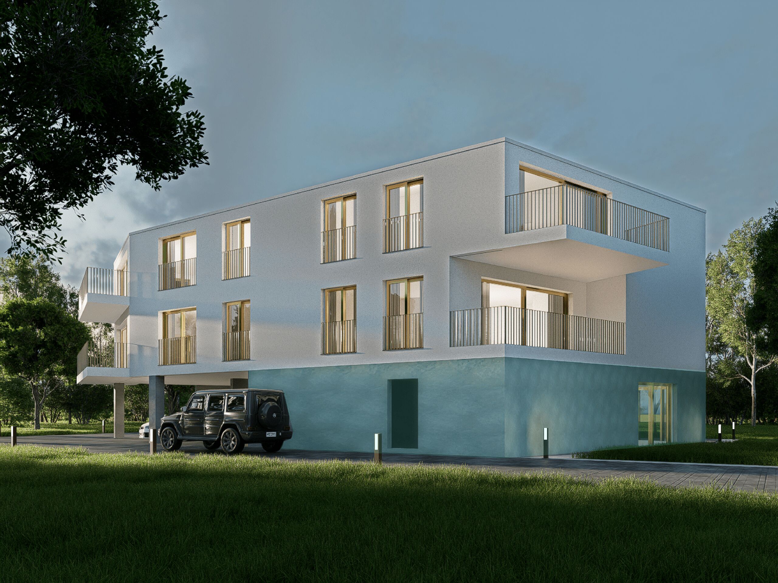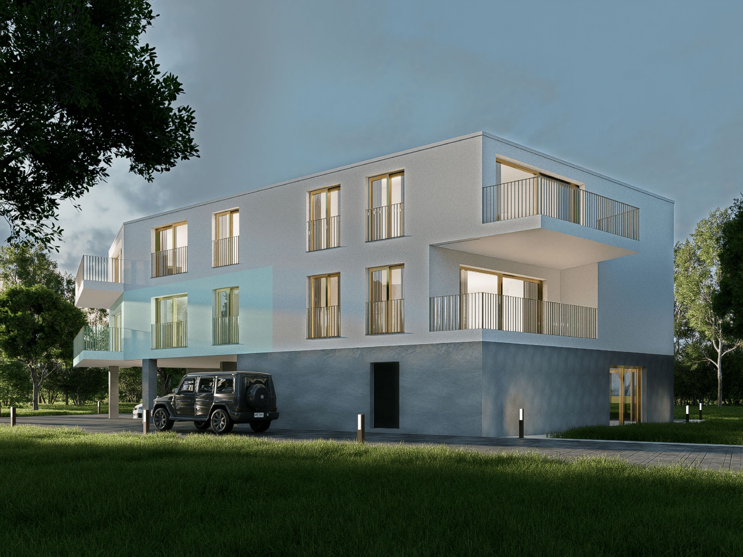 Two covered outdoor parking spaces per lot are available in addition to the sale price. The price is CHF 25,000/unit.